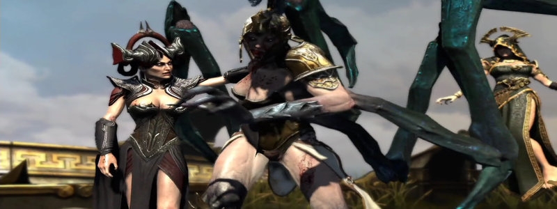 El protagonista del juego es Kratos , un guerrero espartano que rompió su juramento de sangre con el dios de la guerra, Ares. Otros personajes incluyen a Orkos , el guardián del juramento; Alétheia , el Oráculo de Delfos, el Castor y Pólux Profeta , las tres Furias y principales antagonistas: Megara , Tisífone y la Reina de Las Furias, Alecto , y el escritor de Hecatónquiros . La esposa de Kratos, Lysandra , y su hija, Calliope, aparecen en una ilusión creada por Alecto. Zeus , el rey de los dioses del Olimpo, Ares , el dios de la guerra, Poseidón , el dios del mar, y Hades , el dios del Inframundo. Tienen cameos en el modo multijugador, el semidiós Hércules y el cíclope polifeno también aparecen en el modo multijugador como jefes.